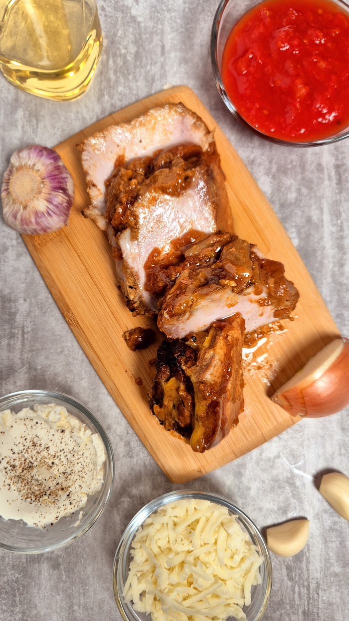 По рецепту используем запеченную свиную корейку, от которой семья отъела всё самое вкусное и деликатно оставила сухой бочок. Булочкам по…, что это случилось еще вчера. Режем корейку на небольшие кусочки.