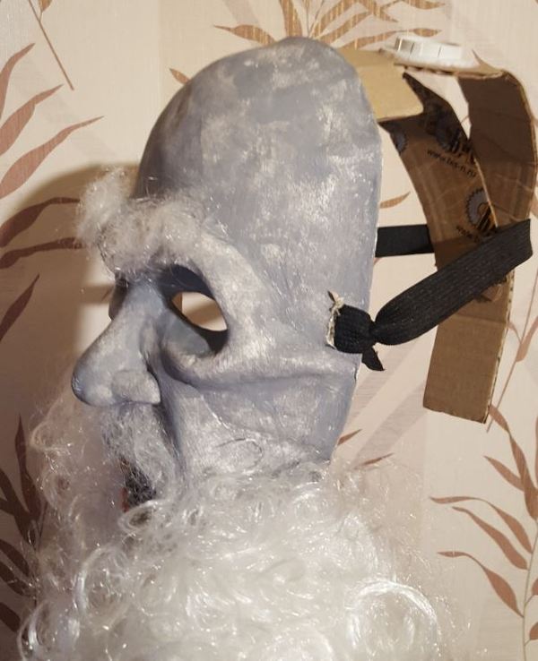 Для того, чтобы маска держалась на голове, в краях маски были сделаны прорези и привязана широкая резинка.