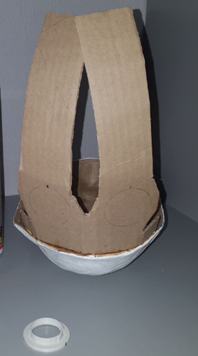 К маске изнутри на ПВА были приклеены картонные площадки для крепления рогов. На этих площадках были размечены места для приклеивания шайб от патронов, куда будут ввинчиваться рога.