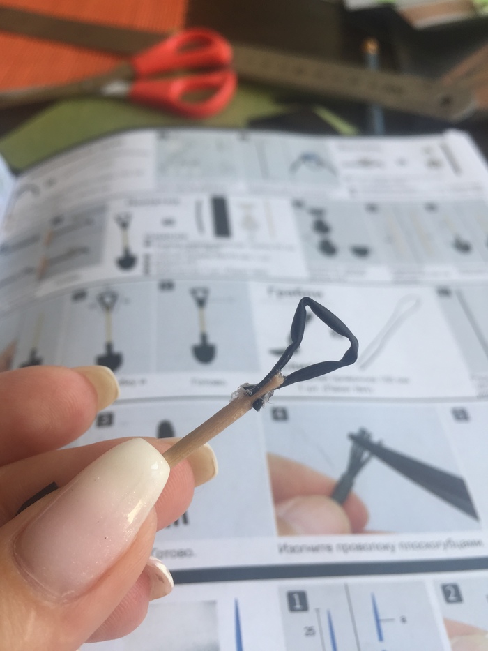 А потом страница чертового садового инвентаря, на котором все мое окружение психовало. Мало того что разработчики на многих вещах сэкономили (например, лейка состоит из 5 бумажных деталей, которые надо склеить между собой и свернуть), так они ещё и предлагают сделать ручку на лопату, приклеив к зубочистке тонкую резинку. Тяп ляп и спустя час у меня получилось вот так: