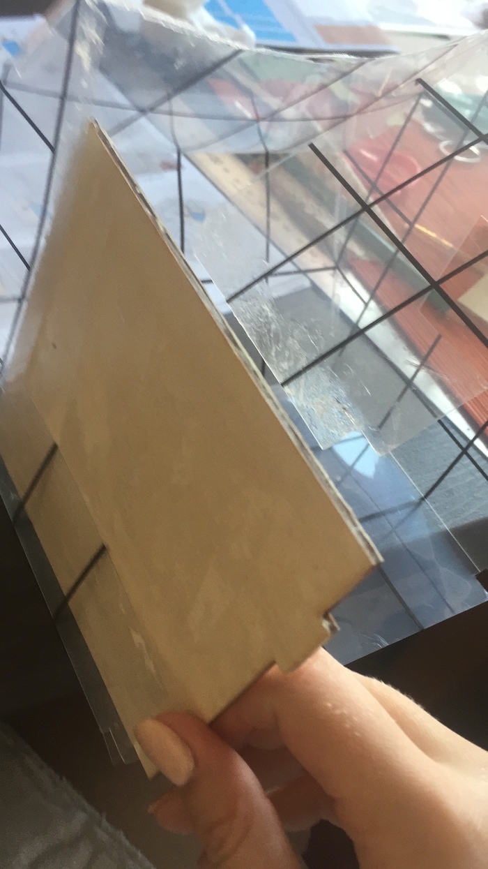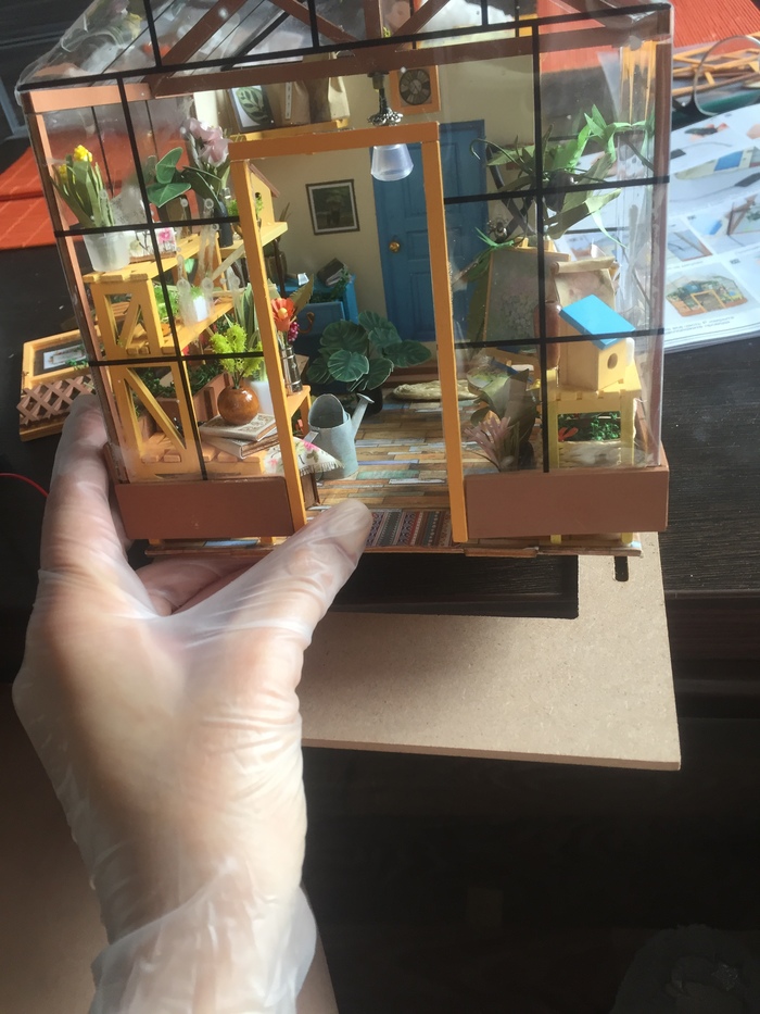 Вот так ужасно это выглядело. Тут был и мой косяк - я перепутала стороны деревяшек и наклеила их не так, как надо было. Пришлось все отдирать, шкурить и клеить заново. В итоге, с горем пополам я склеила деревяшки со всех сторон. Свет провела за 10 минут. А затем попыталась одеть верх на пол. И тут вышел казус. Пазы не совпали с дырками. Либо я накосячила со сторонами пола, либо стен, уже неважно, так как соединить верх и низ невозможно. Поэтому стоя румбокс выглядит, как на первой картинке, а если его немного приподнять, то вот так: