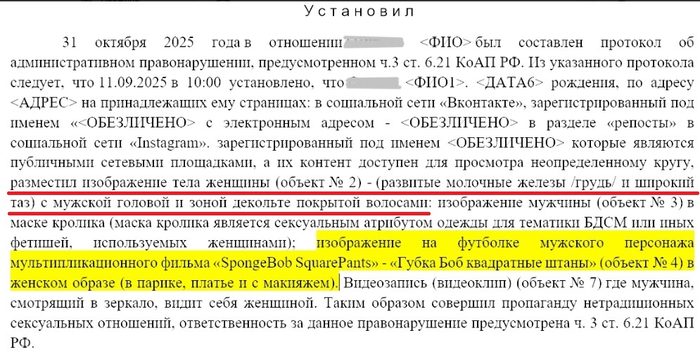 Из протокола следует, что в 2025 году он разместил в соцсетях «изображение на футболке мужского персонажа мультипликационного фильма "SpongeBob SquarePants" - "Губка Боб квадратные штаны" в женском образе (в парике, платье и с макияжем)», а также другие фото и видео.