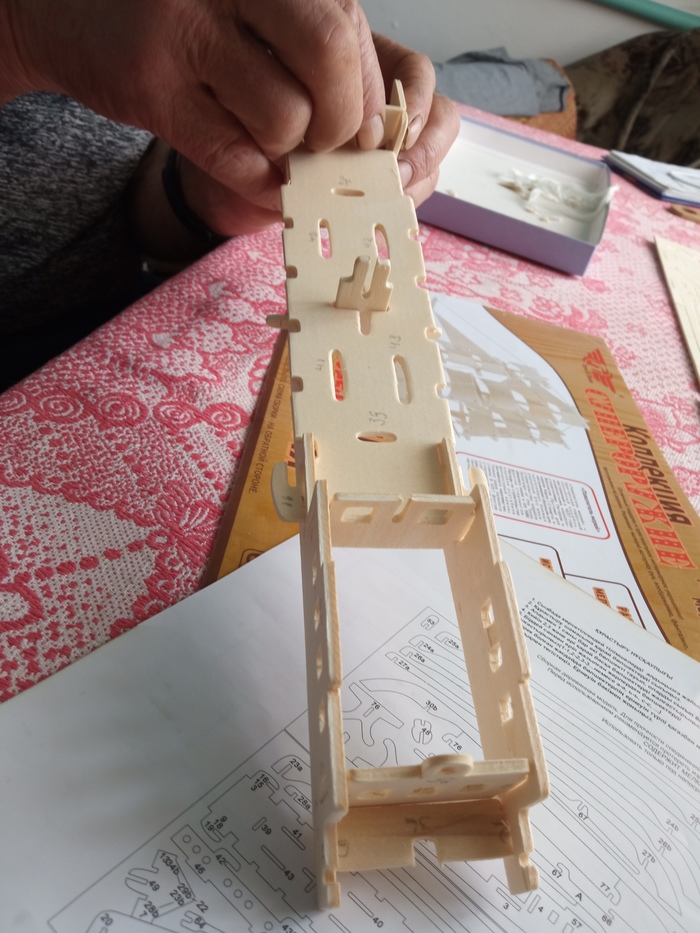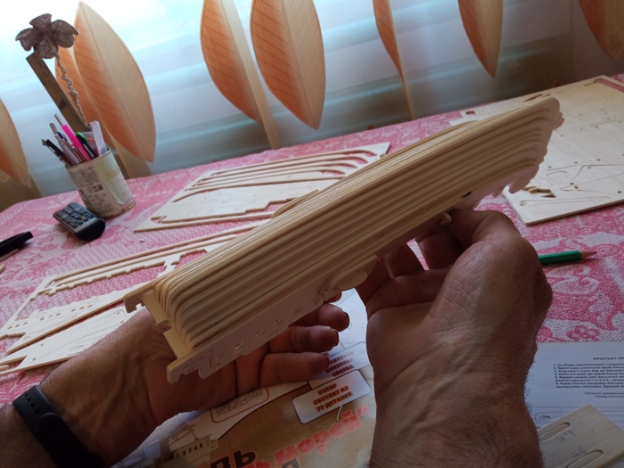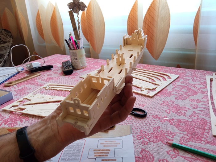 Весенние каникулы я обычно езжу в деревню, и эти так же не стали исключением. И так как каждый вечер после работ, все семейство в основном смотрит телевизор и играет настольные игры, я решил взять что-то новое, и купил конструктор небольшого фрегата из фанеры.