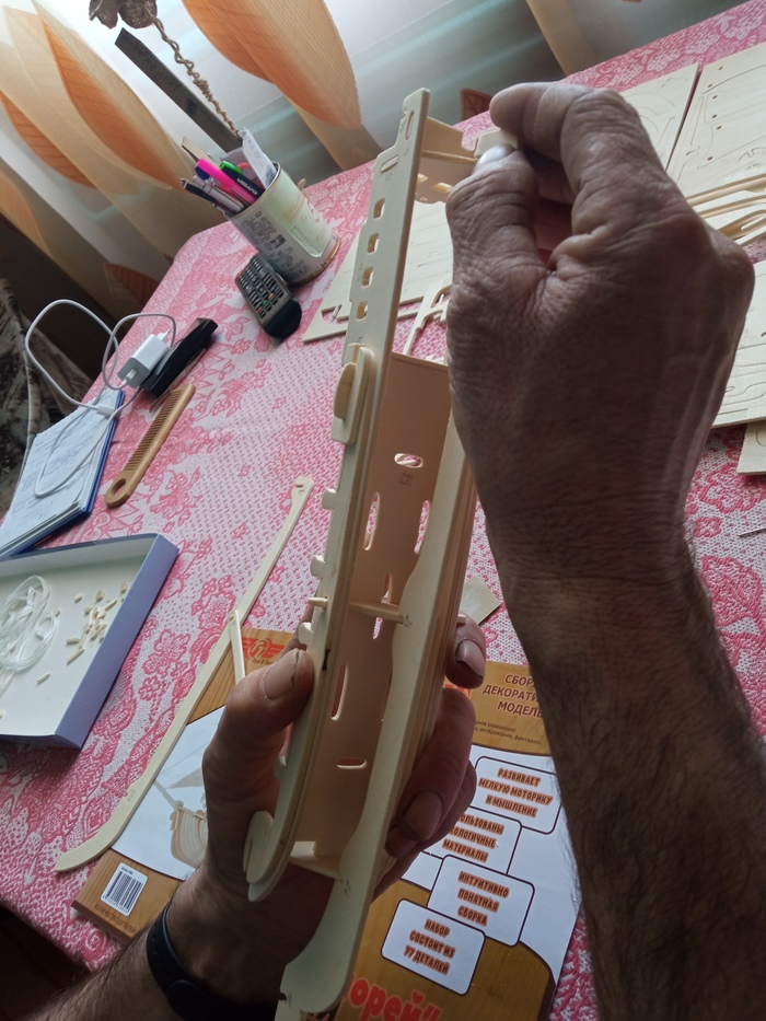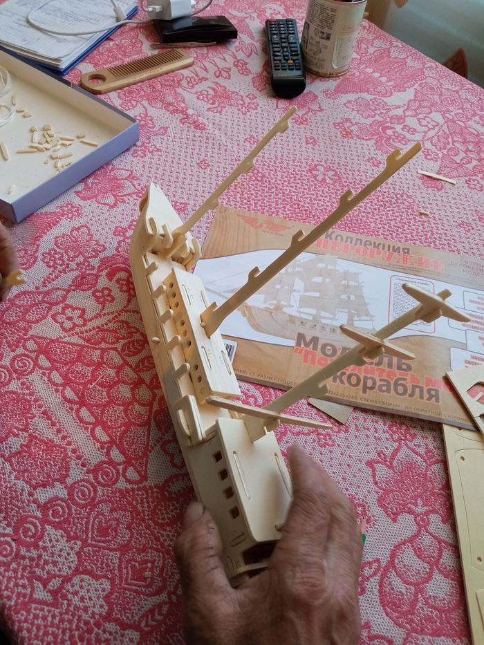 Основная работа была сделана, но впереди оставалось самое сложное - поставить паруса и провести белые нитки "Канаты", которые также были в наборе. Я уже должен был уезжать, и мы успели вместе поставить только центральный парус, остальные два дед монтировал сам. P.s. снимал тоже только я, поэтому моих рук тут нет