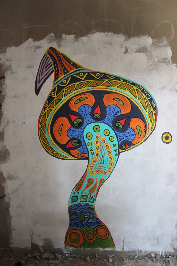 В первый день стена была загрунтована я перенесла эскиз и начала открашивать самые большие цветовые пятна.