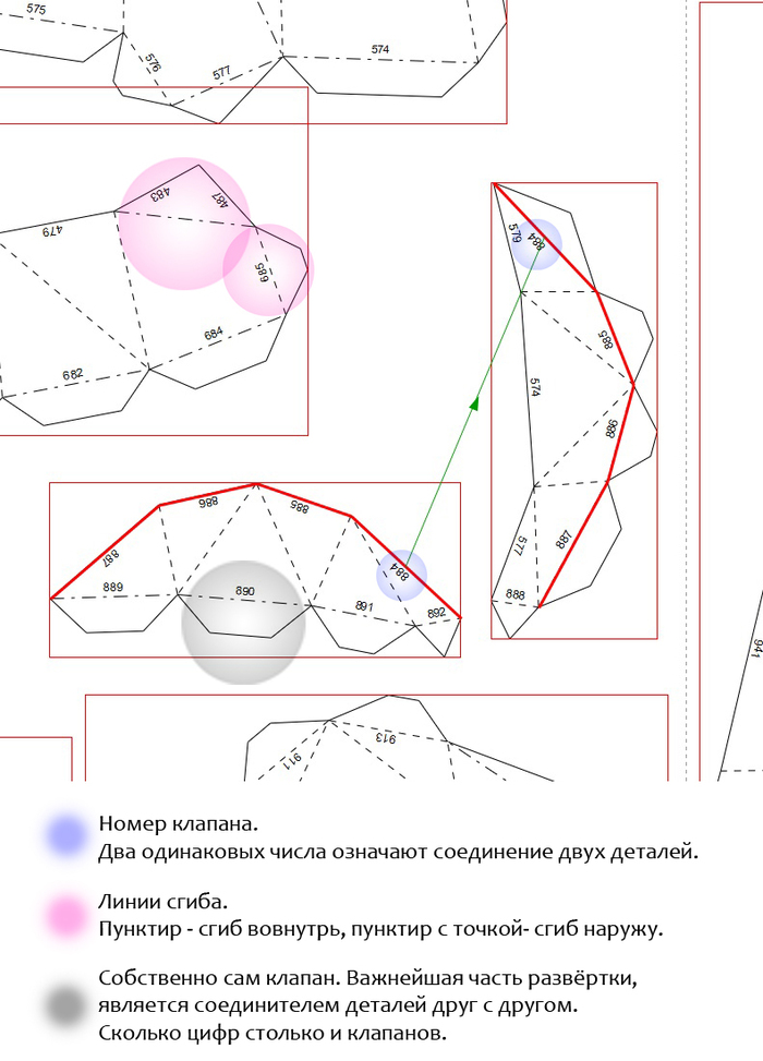 Кратко о самом важном в сборке. Линии сгиба, клапана и их нумерация: