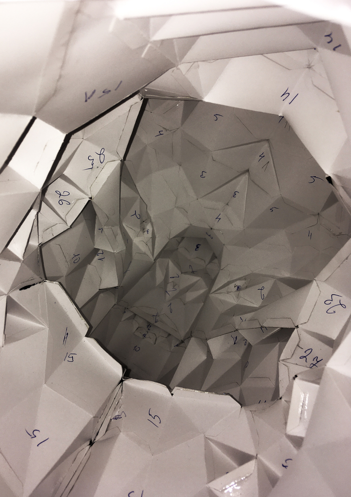 Так выглядит среднестатистическая модель рандомной маски. 7 листов А4, 50 деталей. Белая/бесцветная модель с нанесёнными на неё линиями и цифрами, которые являются по своей сути инструкцией по сборке.
