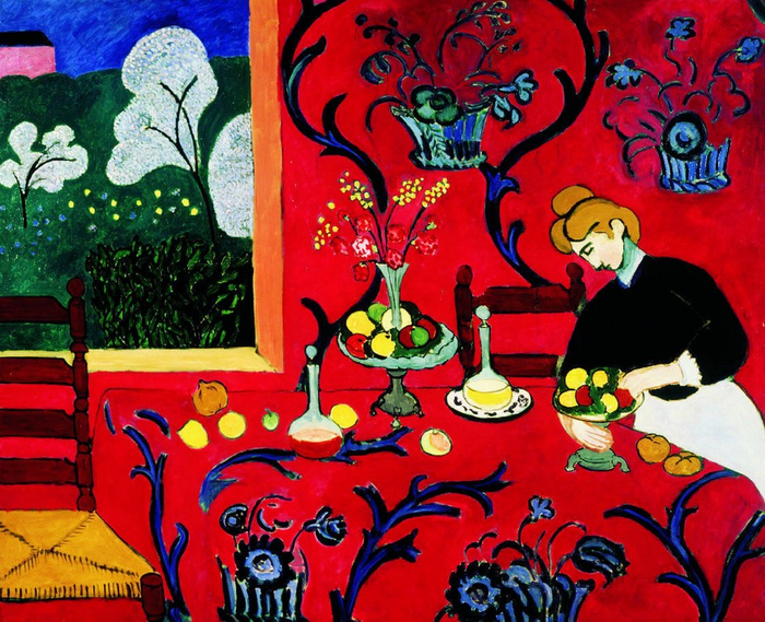 При всей лаконичности, условности и обобщенности он дается в сложных градациях, даже тогда, когда это как будто большие локальные пятна, как в «Красной комнате» (1908). Позже, в 20—40-е годы, раскрытие сложных взаимосвязей цвета усиливается.