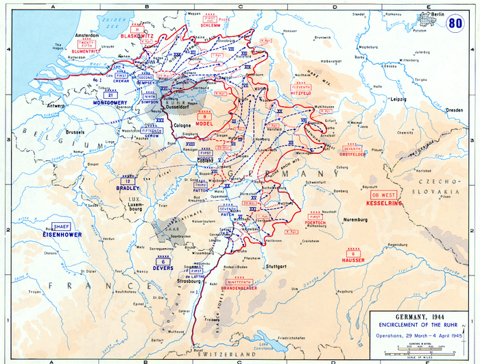 Война для союзников в Европе закончилась 2 апреля 1945 года, когда группа армий "Б" сдалась в Рурском котле. Дальнейшее наступление 3-й и 9-й армии США к Эльбе было похоже на прогулку. Немецкие гарнизоны соревновались кто сдастся американцам быстрее, и лишь раз тигры 12-й армии Венка дали янки решительный бой.