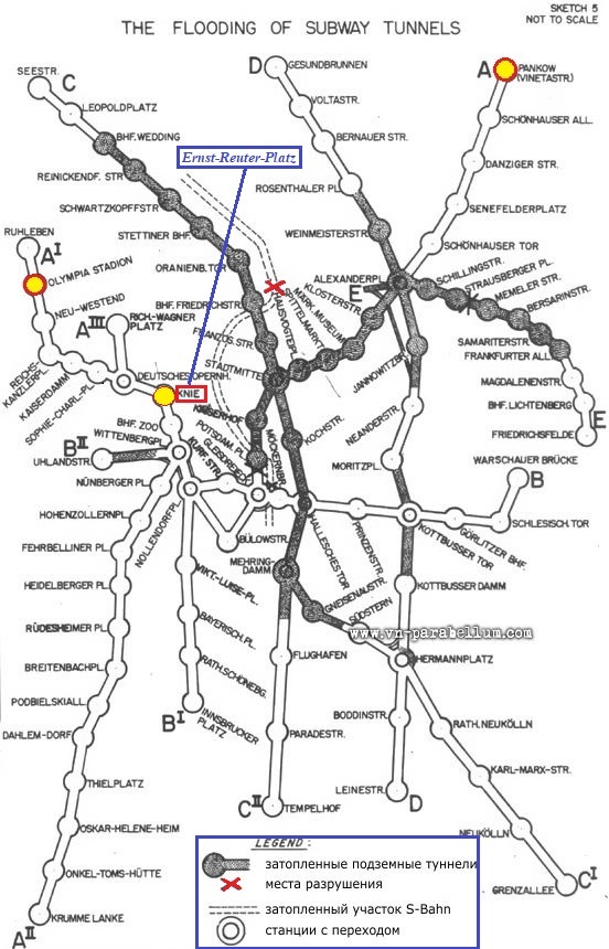 26-27 апреля 1945 г. у командующего 8-й гв. армией появляется идея прорыва в Тиргартен (и к Рейхстагу) по подземным коммуникациям. Все же лучше, чем ломиться с боем по улицам, подземные ходы давали хорошие перспективы и дают их сейчас. По карте имелись две подходящие ветки. В тоннели была отправлена разведка. В.И. Чуйков в воспоминаниях приводит (https://militera.lib…i4/17.html) рассказ разведчиков о рейде по тоннелям метро: «впереди туннель перегорожен кирпичной стеной, со стальными щитами в центре... Продвинулись еще на несколько десятков метров. Засвистели пули. Мы укрылись в нишах. Выждав немного, пустили в ход фаустпатроны и гранаты. Прорвались вперед. Через двести метров — снова препятствие: такая же стена. В общем, оборона немцев в метро построена перемычками: пустой участок — стена, снова пустой участок — снова стена». Наличие затворов в тоннелях метро заставило отказаться от попыток прорыва по ним. Однако рейд разведчиков Чуйкова вызвал у немцев панику. Что происходило вспоминал после войны обер-лейтенант Крёмер, находившийся в туннеле метро под Ангальтским вокзалом на командном пункте «Цитадели» (центрального сектора обороны, Z): «Вдруг сюрприз, вода попадает на наш командный пункт. Вопли, крики и ругательства. Люди борются вокруг лестниц, ведущим по вентиляционным шахтам наверх на улицу. По тоннелям льется журчащая вода. Толпа в панике продирается сквозь поднимающуюся воду, оставляя детей и раненых внизу. Кого-то затаптывают, и вода их накрывает. Водяной поток поднимается на метр и потом медленно уходит. Паника длится около часа» Тот самый метр, что был обещан Борману. Кто это сделал? Крёмер продолжает: «по чьему-то приказу инженеры взорвали предохранительную переборку управления шлюза на Ландвер-канале между мостами Шёнебергер и Мёкерн, чтобы затопить туннели для защиты от русских». Через несколько дней был еще один подрыв. Там да, затопило тоннель, но не станцию.