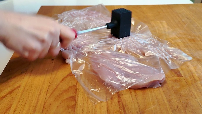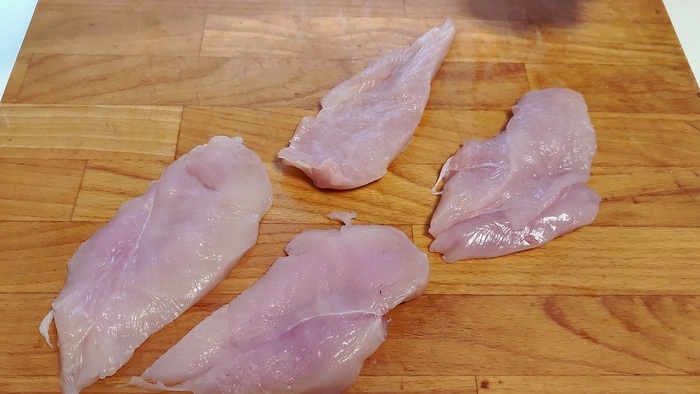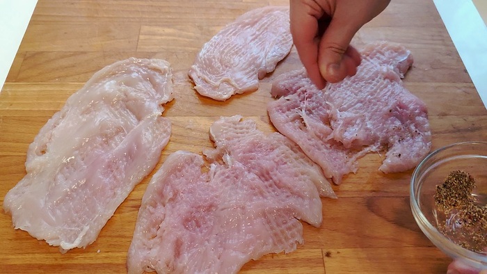 3. Куриное филе разрезать вдоль, отбить с каждой стороны, посолить и поперчить.