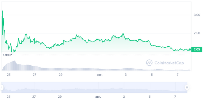 На Coinmarketcap монета торгуется по $2.04, а исторический ценовой максимум составляет – 3,58 доллара.