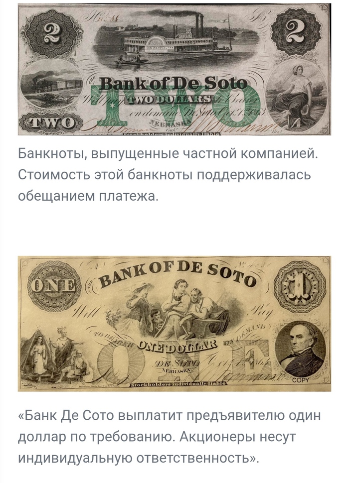 Был в истории США удивительный период с 1837 по 1862 гг., с говорящим названием «эра свободных банков», когда каждый частный банк мог выпускать свой вид долларов.