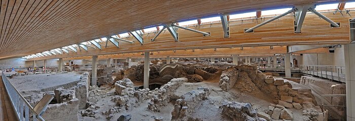 Остатки дома из поселения бронзового века Акротири на острове Санторини, Греция. Оно было засыпано вулканическим пеплом после извержения около 1646—1500 годов до н.э. Стоит подчеркнуть, что это 17 век ДО нашей эры. Само землетрясение и последующее извержение случилось задолго до собрата по несчастью города Помпеи, который законсервировало в 79 году уже нашей эры и отличалось тем, что все жители успели вовремя свалить, поскольку археологи не нашли останки как в Италии.