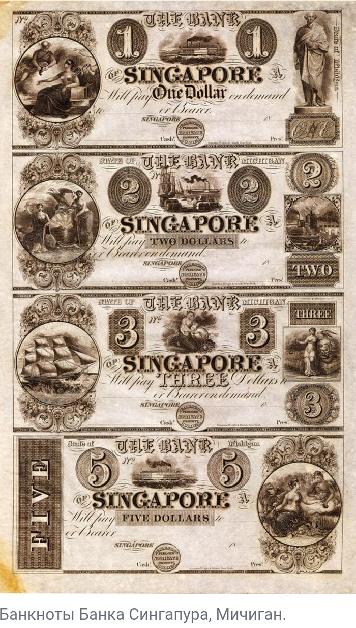 В 1838 году в округе Аллеган были основаны два недолго просуществовавших банка: Банк Аллегана и Банк Сингапура. Однако это не тот Сингапур, который в Юго-Восточной Азии, а город в штате Мичиган, с которым связан локальный финансовый скандал, хорошо отражающий дух эры свободных банков. Оба банка выпускали собственные банкноты и были обязаны иметь достаточное количество твёрдой валюты в монетах, чтобы покрыть как минимум треть обращающихся банкнот. Однако ни один не смог поддерживать этот уровень.