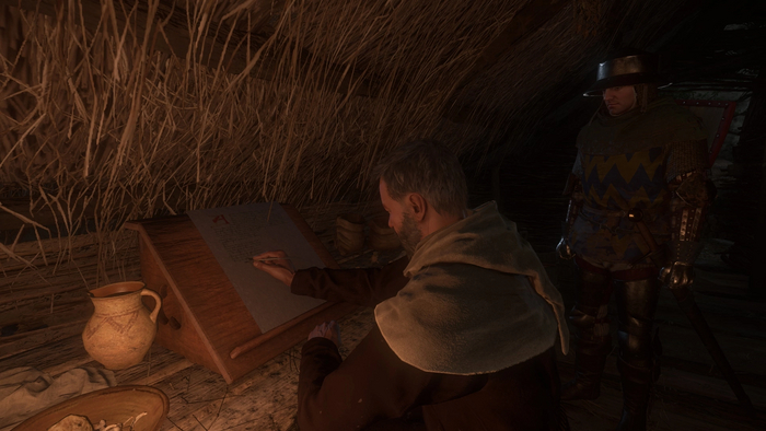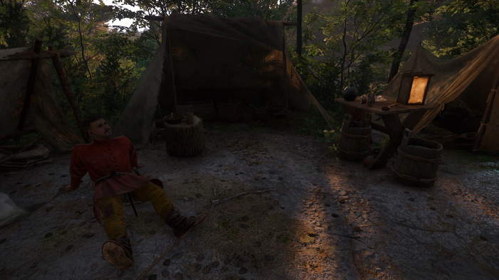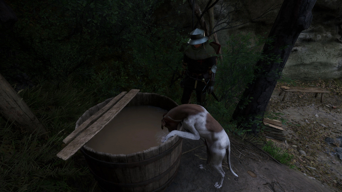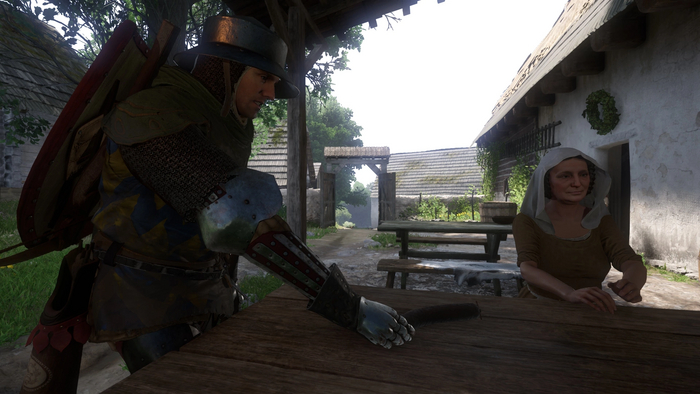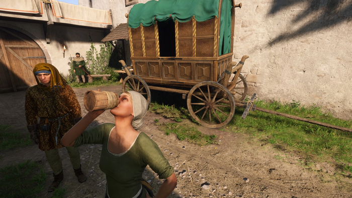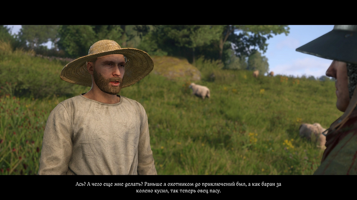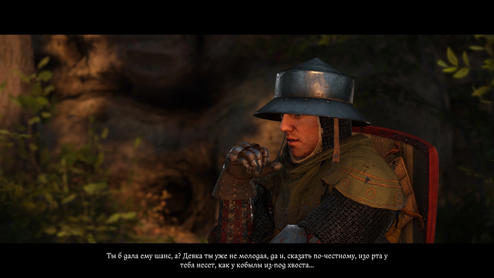 Какая-то рандомная девка спросила: ты что в хлеву ночевал, так воняет от тебя? ( А от меня воняло сильно, давно не мылся, как раз бадью искал, а она рядом сидела). И был выбор оправдаться или парировать. Я думаю чего я буду оправдываться перед какой-то крестьянкой, нажал парировать и сразу начал умываться. И так получилось что проигрывается анимация как Индржих моет рожу и одновременно говорит так спокойно: я то помоюсь, а вот твое уродство никакая вода не смоет. В общем, она обиделась.