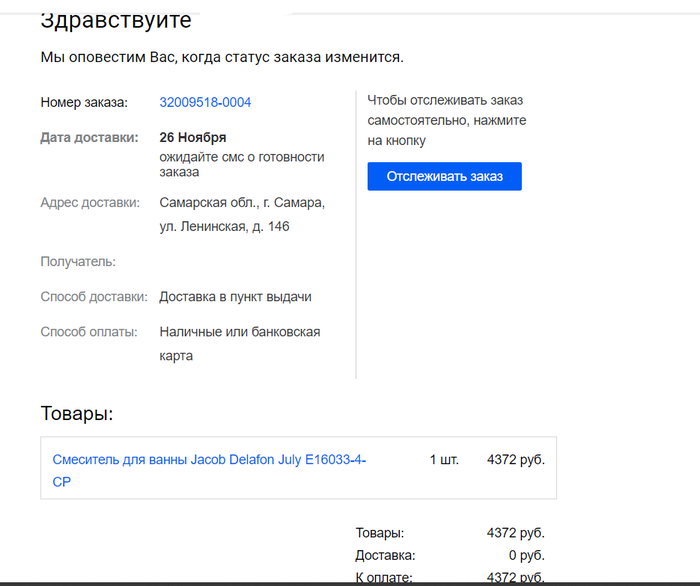 Решила я поменять смеситель в ванной, да не на какой-то а на заграничный, чтоб прям навека - и детям, и внукам. Рыская по сайтам, наткнулась на привлекательное предложение на Ozon - Jacob Delafon July E16033-4-CP всего за 4372 рубля! Это при средней цене на рынке в районе 6 тысяч! Я, конечно же, не смогла пройти мимо и оформила заказ с оплатой на месте, на почту пришло письмо, мол ждите, все привезем до 26 ноября.