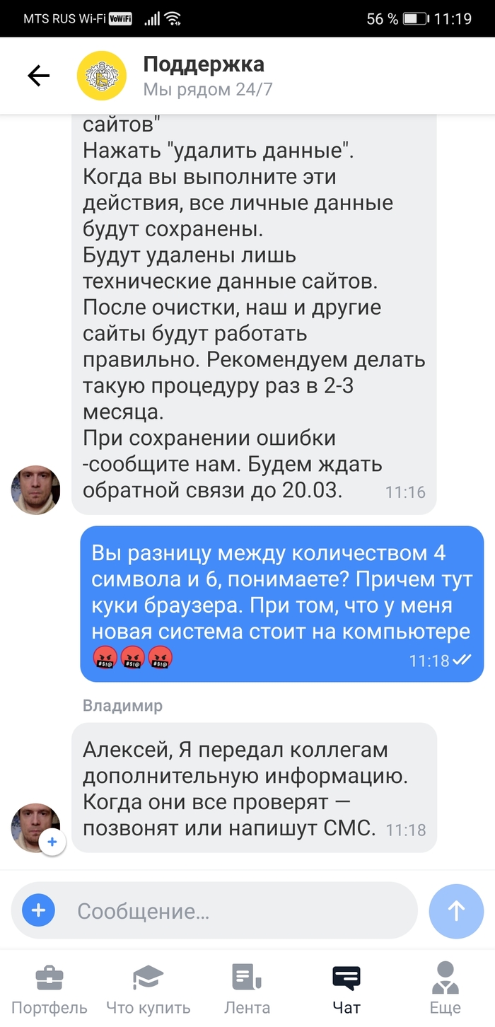 Пришла SMS «Мы проверили возможность входа. Подробности: 88007557466». Позвонив ( в 14:16) мне зачитали ответ по исправлению ошибки «4 или 6 цифр». Но это я и так уже знал, получив долгожданные 6 цифр после N-попыток. А вот на вопросы; «А что с приложениями, вводить данные? Вы перезагружали мой личный кабинет?», оказалось, что предыдущий работник даже не сделал запрос -обращение! Составили жалобу на сотрудника и еще раз запрос. Прислали, что ответ будет до 22 марта.