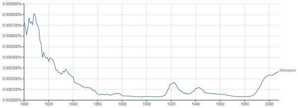 С термином "Империя" связана интересная динамика. Пиковые значения во времена войны с Наполеоном и постепенный спад с небольшими подъемами в послереволюционный период и во времена ВОВ. После развала СССР наблюдается тренд на повышение использования данного слова в литературе. Возвращаемся к мыслям об империи?