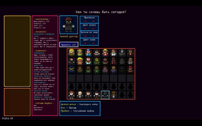 В начале нам доступна только половина персонажей (около 16ти), чтобы открыть остальных нужно выполнить различные мини-события. Например, чтобы поиграть за копа, необходимо подкупить трёх полицейских, а чтобы открыть комика, вам придётся убить кого-нибудь с помощью банановой кожуры, можно даже себя.