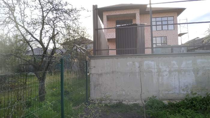 Есть еще один момент - судя по всему уровень бетона - это то, что они залили весь свой участок, и, соответственно, подняли высоту своего участка на приблизительно 1,5 метра. На фото видно, что остальные участки других соседей и наш собственный находятся на равной высоте, а участок строящегося соседа - значительно выше. До начала строительства все абсолютно участки находились на одной высоте.