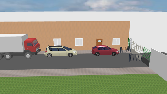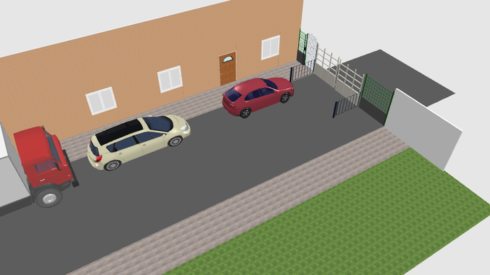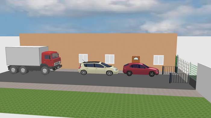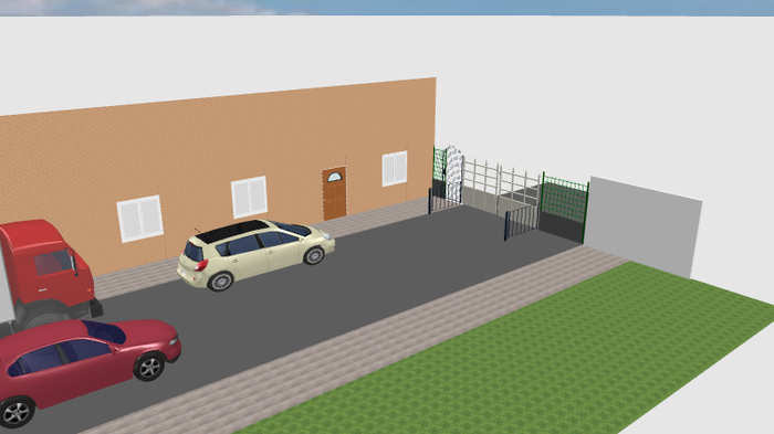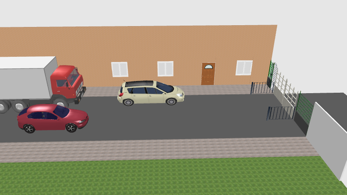 Красная моя машина (условно хетч С-класса). На месте белой был мерседес GL (размеры машин на схеме постарался передать по точнее). Грузовичок на схеме, это условная машина одна из тех которые не трогаются с места неделями. Впереди автоматические ворота. На заборчиках у ворот датчики, которые останавливают открытие ворот если между ними что-то есть. Рядом с воротами со стороны дома калитка - выход с огороженной территории. Второй дом стоит напротив первого (со стороны наблюдателя)