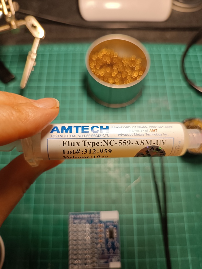 Паяльная паста + фен. Так же нанесла флюс, затем капельку пасты. Только чтоб отсадить немного пасты, пришлось постараться, надавила на шприц, а она и полезла, останавливаться не хотела)