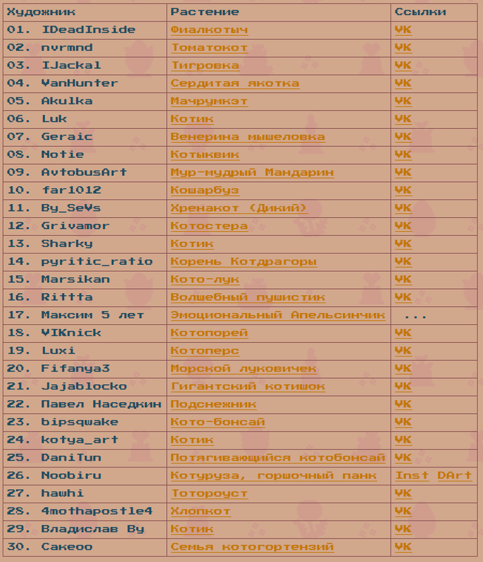В коллаборации приняли участие 30 художников, от начинающих до опытных. Каждый из них нарисовал своё уникальное которастение, а также, при желании, придумал различные аксессуары и оформил фон.