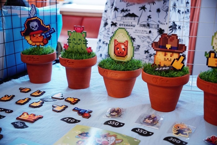 Создание пробного концепта пришлось совмещать с учебой на первом курсе университета. Как пиксель-арт художник, я решил использовать этот стиль для дизайна первых шести растений. Друг помог вырезать первую фигурку, которая была позже раскрашена акриловыми красками в общежитии. Для устойчивости внутрь горшка был залит гипс, а фигурка была закреплена монтажной пеной. Растение получилось ярким и прочным, хотя на создание ушло около двух дней.