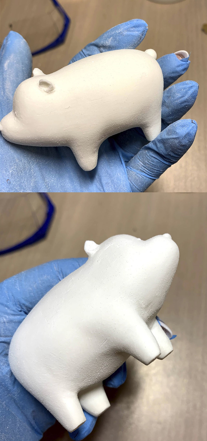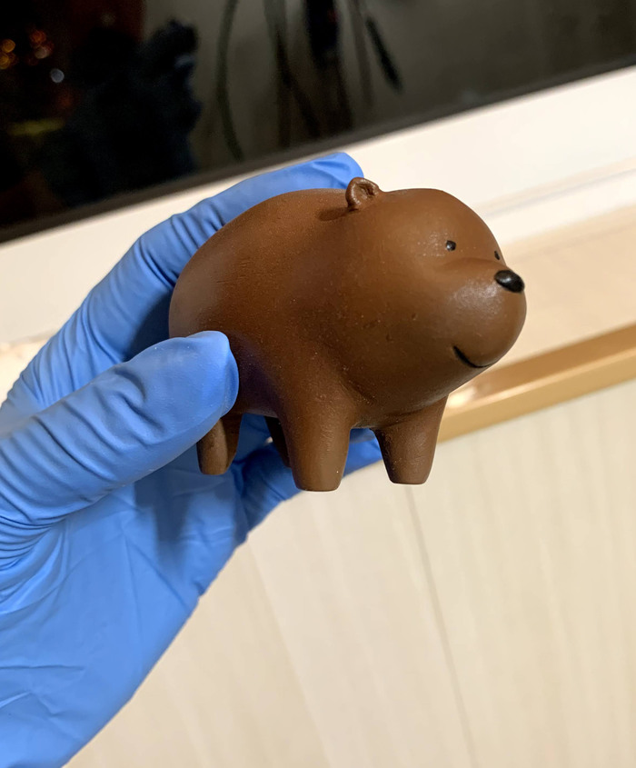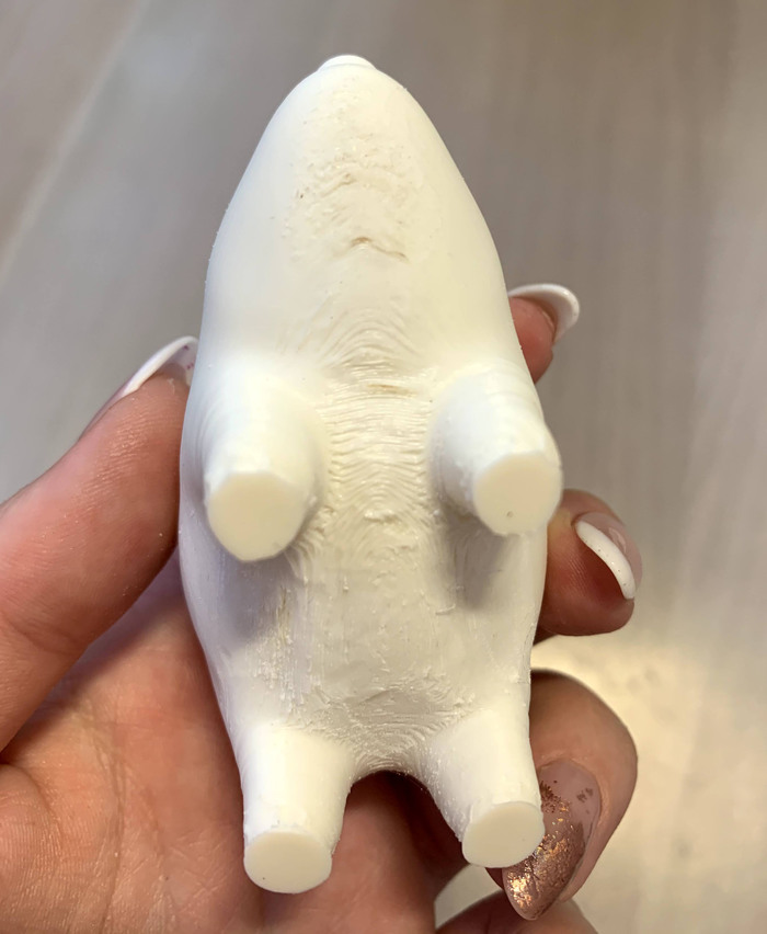 По итогу фотка, что получается после шлифовки твердосплавной фрезой. Как видно пузико и шея немного выровнены, но нужно еще аккуратно выровнять поверхность спины и попец медведя при наличии таких полосок.