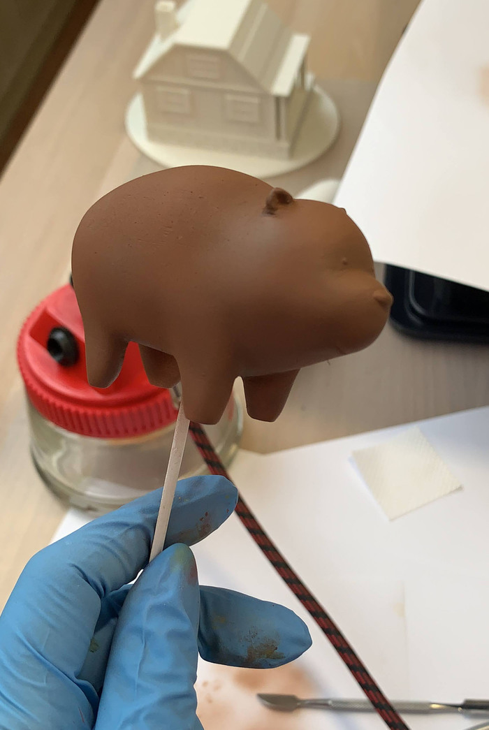 Дальше красила медведей акриловыми матовыми красками через аэрограф. Использовала матовую Tamiya, мне было интересно с ней поработать, краска ложится классно, пигмент очень хорошо размельчен и аэрограф у меня не плевался. До Tamiya, попробовала акриловые краски от Decola...лучше бы я этого не делала, краска почему-то у меня свернулась и пришлось повозиться с аэрографом, отмывая его.
