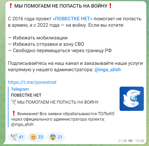 Так же на канале регулярно появляется реклама канала, где обещают удалить данные человека из реестра военкомата: