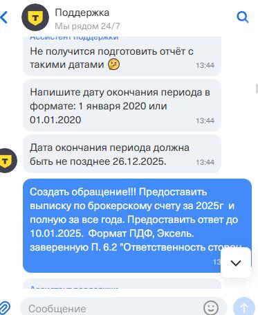 Tinkoff Investments,invest@tbank.ru,сегодня в 15:05 07.01.25 предоставил выписку по счетам Заверенную и вопросов стало еще больше!!!