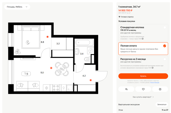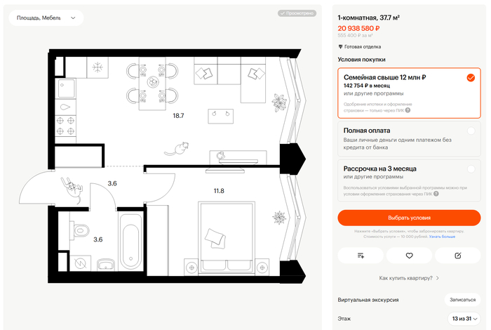 1 000 000 первый взнос + 516,2 платежи пока строили + 835 мебелировка под ключ + страховка (около 20к) = 2 371 200 затраты на квартиру + не забываем про платеж 17,8 тысяч в месяц.