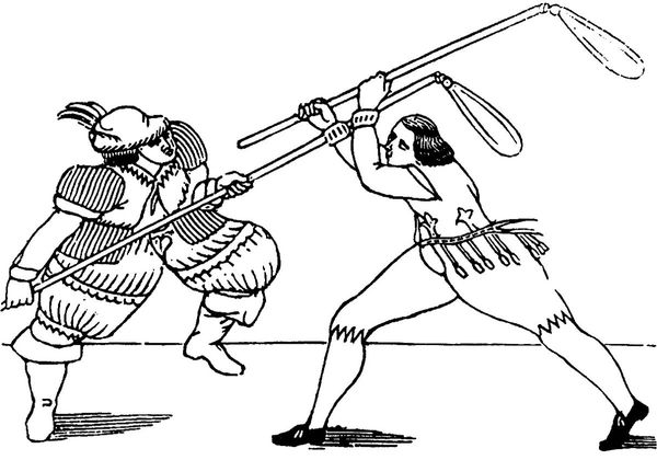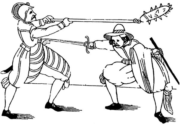 Цепоносцы по Якобу Зутору: в ситуации «цеп против цепа» оба участника используют, пожалуй, скорее полувоенное оружие. А вот тому, кто со шпагой, противостоит именно боевой цеп.