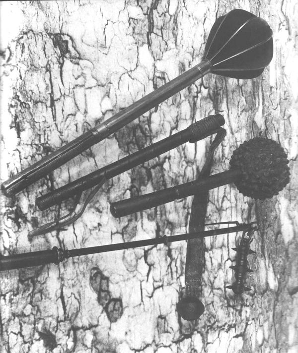 Экспонаты из Берлинского оружейного музея: две булавы (венгерская и, предположительно, татарская), калмыцкая плеть-кистень эпохи наполеоновских войн и немецкий кавалерийский боевой цеп XVII века.