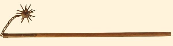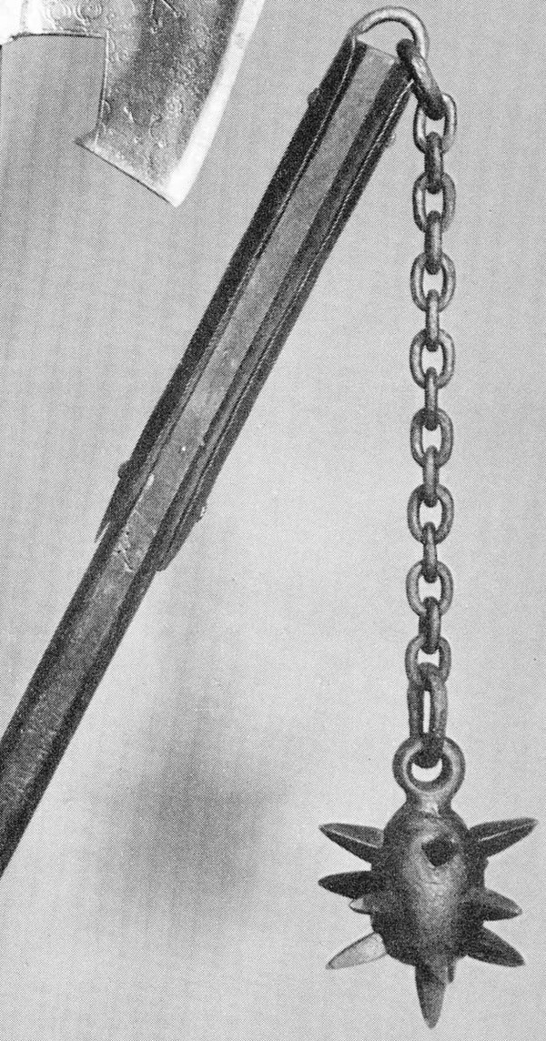 Раз уж прозвучали названия, приведем и расшифровку. «Кеттен» по-немецки — цепь, следовательно, кеттенморгенштерн — цепной моргенштерн (просто моргенштерном именовалась шипастая булава, ударная часть которой посажена не на цепь, а непосредственно на древко). В переводе с немецкого Morgenstern — «утренняя звезда» (форма и в самом деле напоминает звезду, плюс к тому данное словосочетание — устаревшая форма приветствия «Доброе утро!»). Фламандское название подобного оружия — «годендак» («добрый день»). Отичный способ сердечно поприветствовать врага!