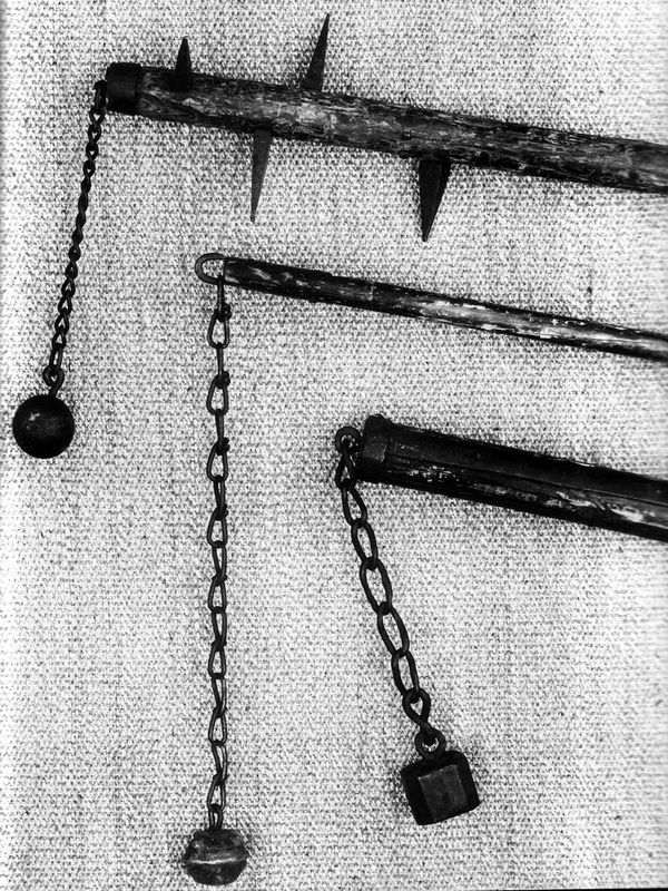 Раз уж разговор пошёл о форме рабочей части: у кеттенморгенштерна било тоже могло иметь не шарообразные, а грушевидные очертания, могло представлять собой усечённый конус и разного рода биконические, пирамидально-призматические фигуры. Наиболее крупные из них бывали объёмом порядка 700 см3: они присутствуют в каталожных описях, да и сохранившиеся образцы выставлены в музеях Европы. Существовали даже смертобоища с билом под 800 см3 и древком, как у алебарды. А кеттенморгеншетрнов с рабочей частью в 400–500 см3 (то есть до полулитра), было даже немало. Стоит отметить, что это фактически рабочий максимум. Он только по весу рабочей части приближается к 4 кг, а если учесть цепь и рукоять (неизбежно прочную, массивную, вырезанную из плотного дерева вроде вяза, да ещё в паре мест окованную железом, а порой и с дополнительными остриями), то весь агрегат точно потянет на шесть кило.