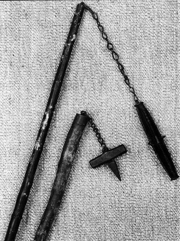 Да, и чтобы не возникало путаницы: у цепа рабочая часть представляет собой палку-«веретено» (то есть нунчаку — это, по сути, цеп). Било же кистеня и его производных чаще всего имеет шарообразную форму.