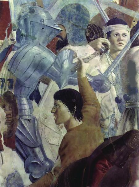 Продолжим движение по оси веков. На знаменитой фреске Пьетро делла Франческа «Битва Ираклия с Хосроем» присутствует то, что немцы назвали бы «тройной кеттенморгенштерн», а итальянцам более подобает называть «трёхглавый (tricefalo) маццафрусто», в сравнительно коротком одноручном варианте, удобном для ситуации «смешались в кучу кони, люди». Это оружие обученных воинов, но всё же не рыцарей. Из защитного вооружения у сошедшихся в схватке пеших бойцов только кулачные щиты, из наступательного — у одного тот самый маццафрусто, у другого клинок полусабельного типа с асимметричной гардой. Кто кого? Мы бы поставили на «маццафрустиста»: малым щитом очень трудно отразить удар такого оружия, во всяком случае полностью отразить, а если он окажется отражён лишь частично, то воин с цепом имеет преимущественный шанс повторить атаку прежде, чем его противник опомнится. Хотя если все три шара пройдут совсем уж мимо цели, ответная фраза клинка прозвучит быстрее. Шипов на боевых поверхностях нет, так что шар ни на одно мгновение не застрянет в теле или в деталях вражеского снаряжения. Зато есть чуть заметные выпуклые пояски, позволяющие сконцентрировать энергию если не «в точку», то «в линию».