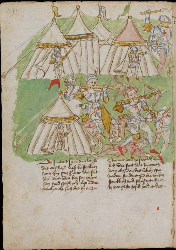 Хендган подобной конструкции встречается в швейцарском оружейном кодексе из St. Gallen, 1465, Fol. 38. Обратите внимание на стрелка, выходящего из самого правого шатра. Он держит в руках хендган, с весьма коротким румпелем и чертами напоминающий описанный нами выше.