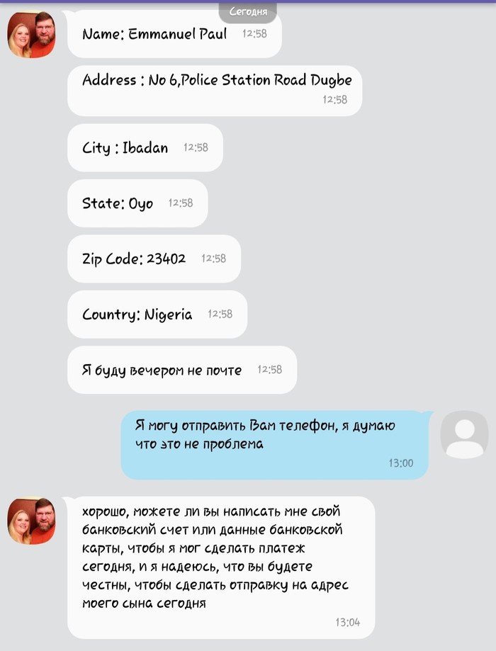 Да неужели, Нигерия, интересно) погуглила адрес, записи о нем тянутся аж с 2011 лохматого года. Очень жаль,что мне стало лень доводить дело до конца. Вроде как присылают очень интересные поддельные чеки о переводе, потом вроде как переводят в 2 раза больше денег и половину просят перечислить им обратно) как я нагуглила, попалось много людей) Берегите себя😊