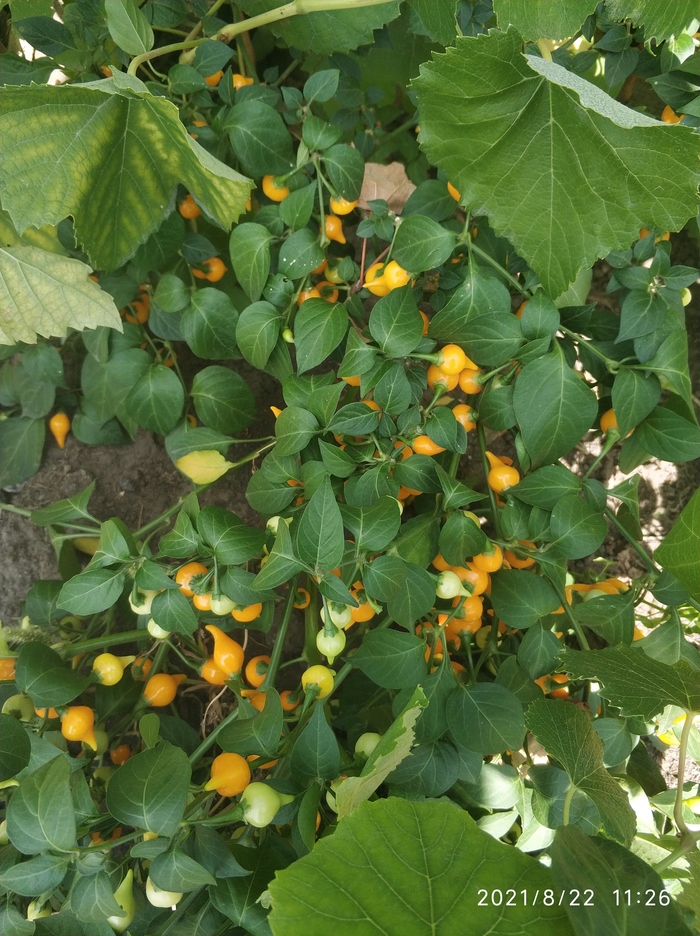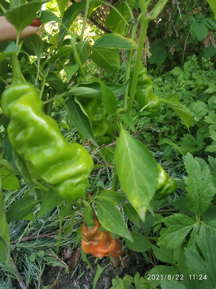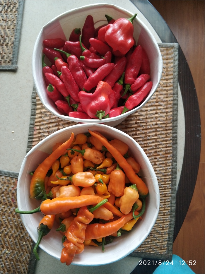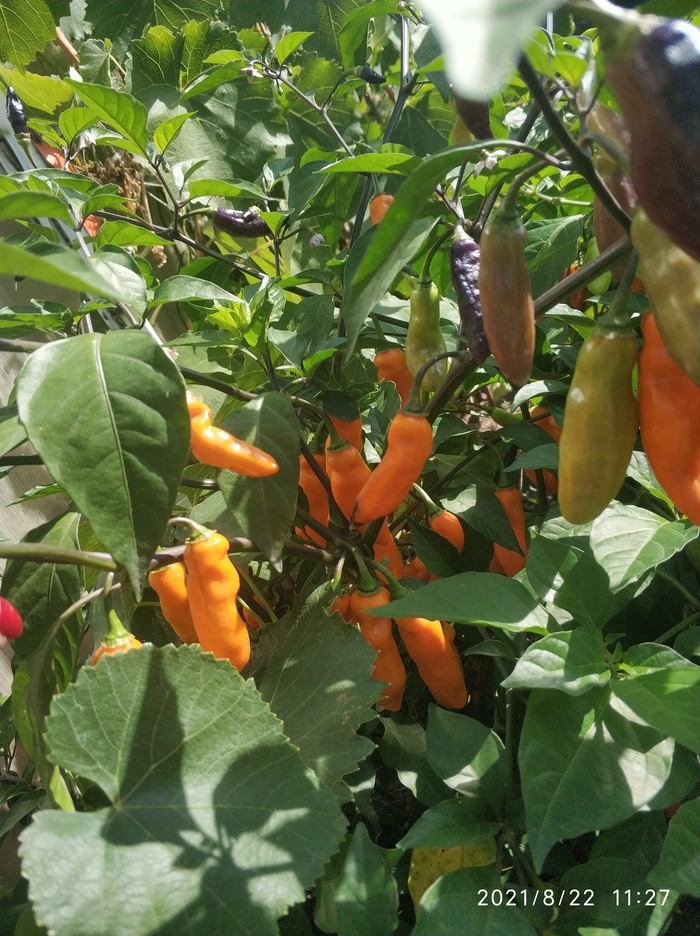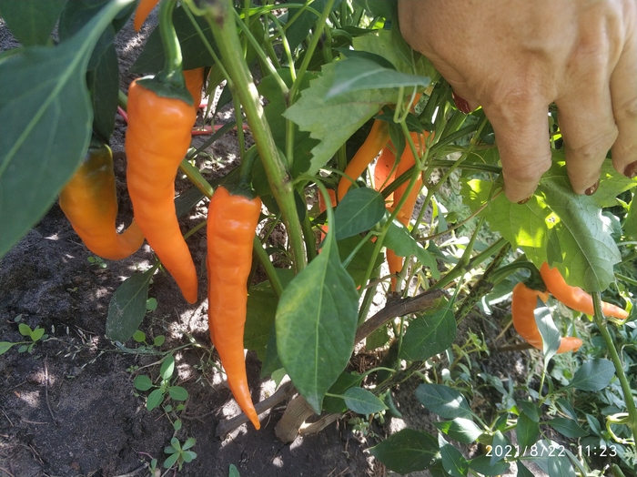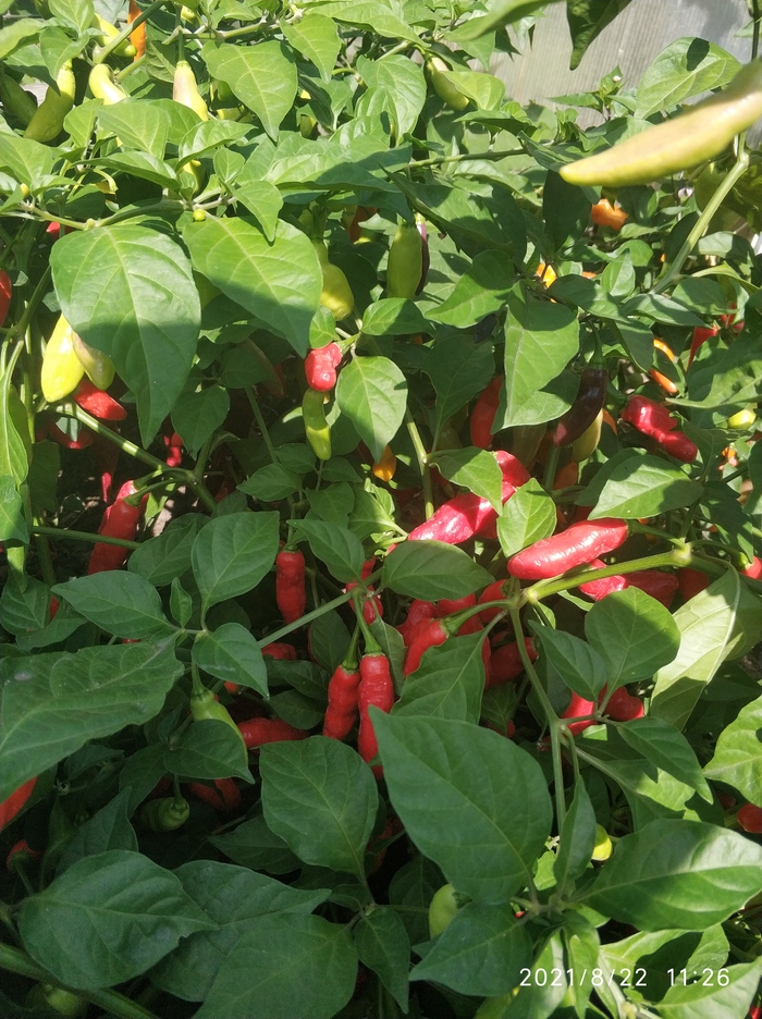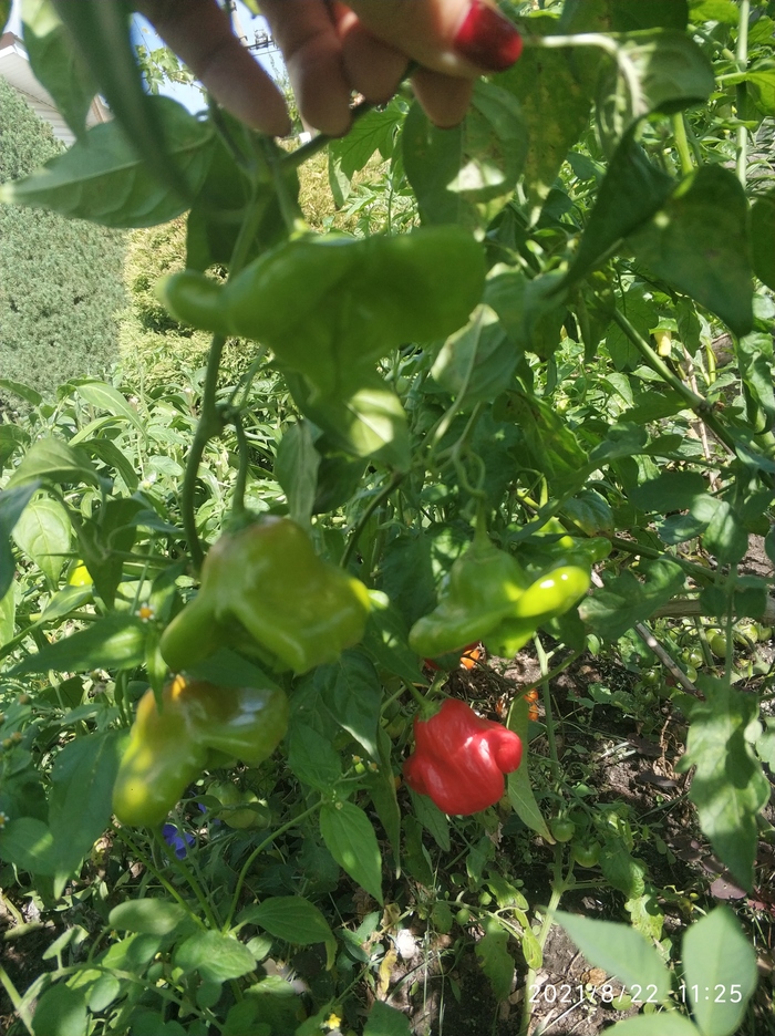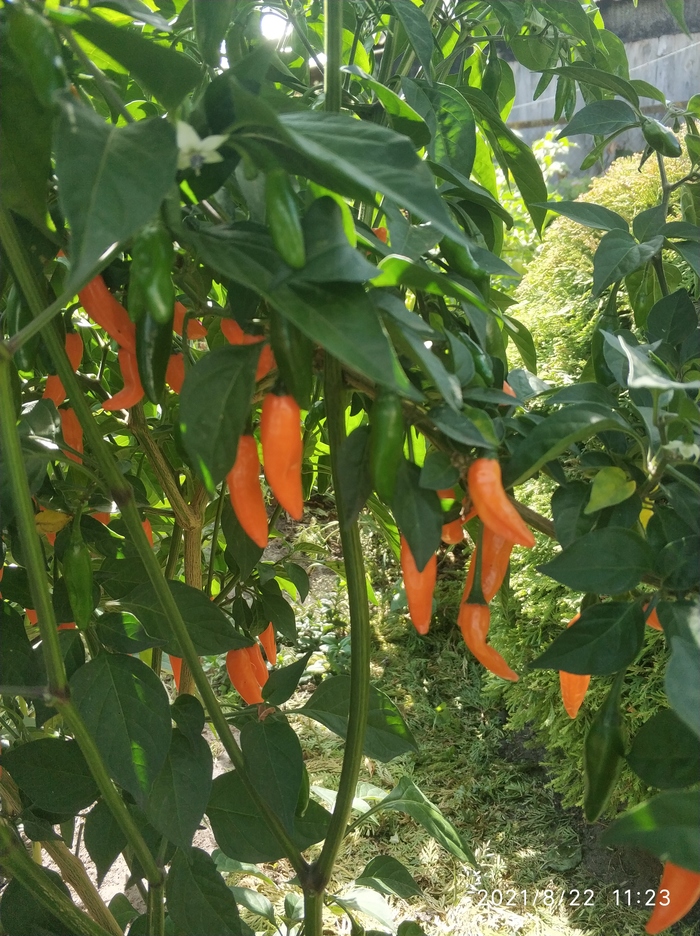 Весной все кустики были пересажены в открытый грунт. Плоды, по сравнению с теми, которые завязались дома в горшках, стали крупнее в два, а некоторые и в три раза. По вкусу острота стала более сильной. Плодов завязывается очень много, то что на фото, только часть урожая. Никаких танцев с бубнами перед кустами не было, только полив. Весной стандартная подкормка куриным помётом. И все. Я придерживаюсь принципа чему расти, все вырастет.