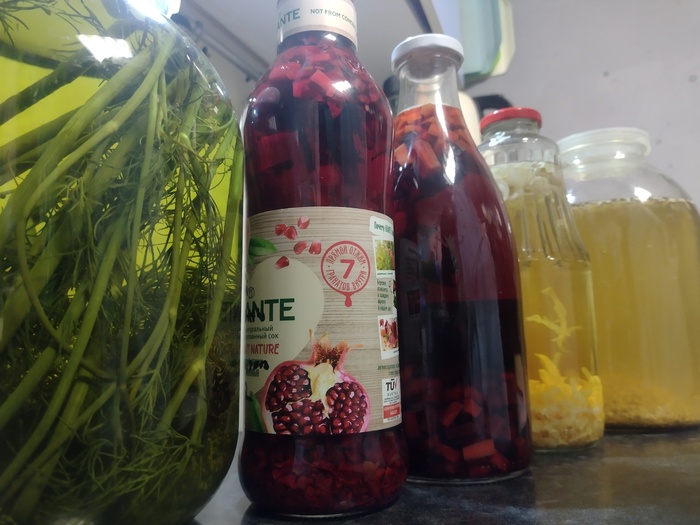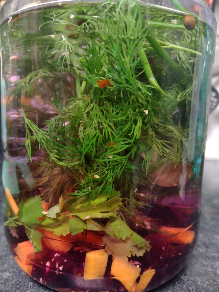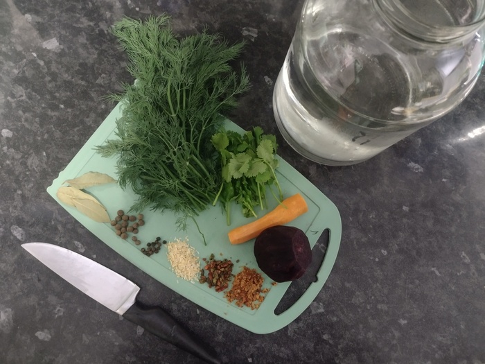 Для этого нам понадобится свекла одна штука, морковь мелкая, тоже одна штука, пучочки укропа и петрушки. Перец черный, душистый и, естественно, лаврушка. Больше свежих овощей у меня не было, поэтому добавляем оставшееся с походов сушеное: лук, помидоры, болгарский перец, всего по чайной ложке примерно. Как-то режем и сыпем в банку с самыми чистейшим ректификатом разбавленным до 45°.
