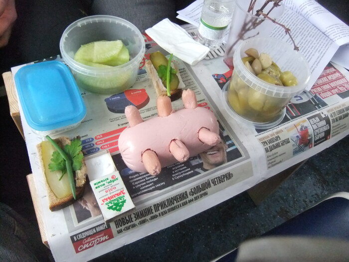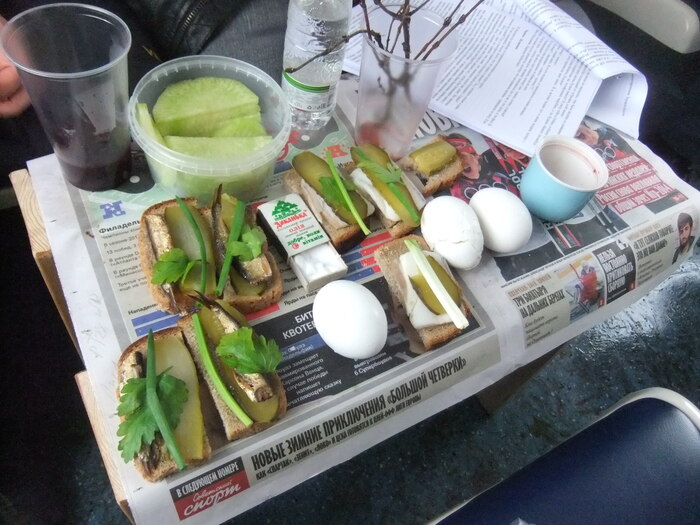 На этом фото всё понятно и логично. Бутерброды со шпротами и бутерброды с салом. Соль, непременно в спичечном коробке. Обязательные давленые яйца. Вымоченная в воде редька. И всё это на газете “ Советский спорт” . Но только тонкий знаток и ценитель Поэмы “ Москва-Петушки” отметит то, как бережно мы отнеслись к авторскому тексту.