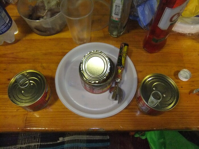 И было много разных явств. Главными из которых были кильки в томате , привезенные из Мурманска. Но разве могли мы , празднуя завершение маршрута Москва - Петушки , варварски открывать этот деликатес, дёргая за кольцо? Конечно нет! Только так, перевернув банку. Как в 1970 г.