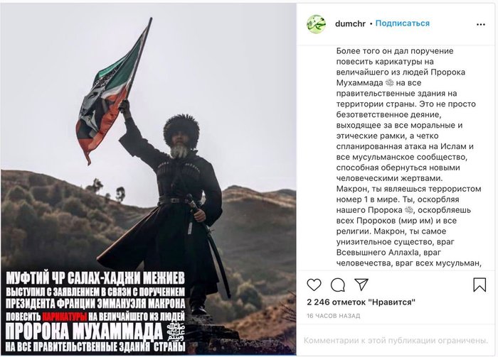 На первой картинке протесты в Саудовской Аравии, на второй - инстаграмм муфтия Чеченской Республики Салаха Хаджи-Межиева, в котором он пообещал каюк западной цивилизации и лично Макрону - гнев двух миллиардов мусульман.