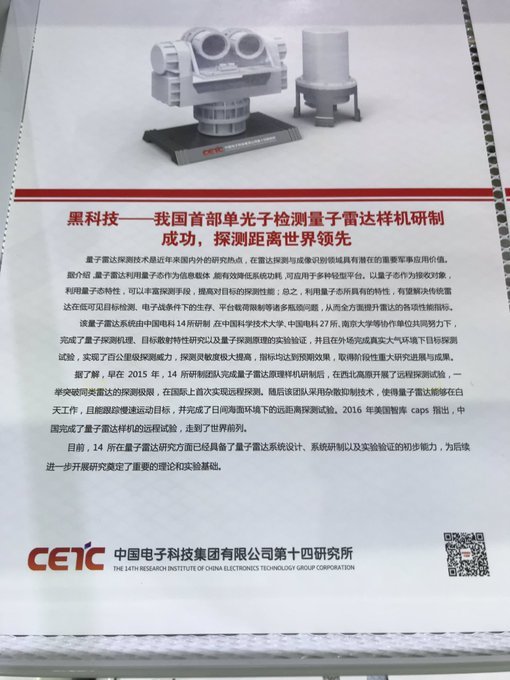 Китайская корпорация CETC представила прототип квантового радара, с помощью которого можно будет обнаруживать малозаметные цели даже в условиях радиоэлектронного противодействия. Как пишет Aviation Week, презентация радара была проведена в рамках авиашоу в Чжухае в начале ноября 2018 года, однако на нее были допущены только китайские корреспонденты. Представленное устройство уже прошло ряд успешных испытаний на полигоне на северо-западе Китая.