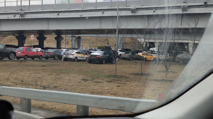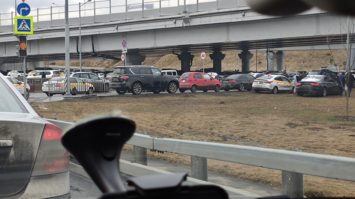 Сначала мелькнула мысль (глупая, наверное) что это участники ДТП съезжают с дороги, дабы не мешать проезду остальных (на этой развязке, естественно никаких парковок не предусмотрено). Но после одной пары машин, туда чуть ли не через одного начали съезжать многие другие. Тут у меня уже был какой-то разрыв шаблона - упорно не понимал, что за тусовка среди дня на такой импровизированной парковке. Протискиваясь дальше, увидел еще более забавную картину - прилежащий тротуар был тоже битком заставлен машинами. Но еще больший прикол был дальше: я насчитал 4 ряда припаркованных на прямо на проезжей части автомобилей, оставивших полтора (а по сути всего один) ряда для проезда остальных.
