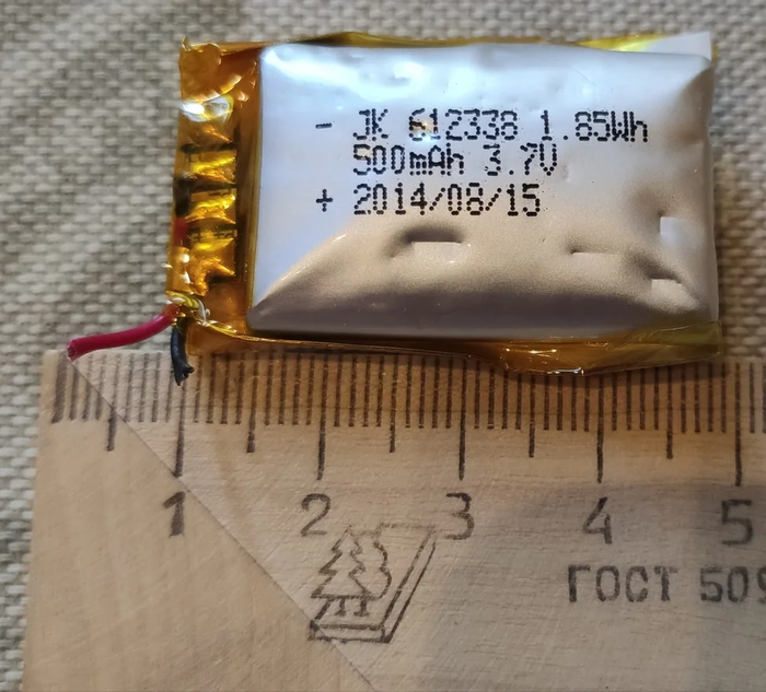 Вот такая батарея стояла. Без батареи не включается. Элемент этот как раз не могу найти, все не то показывает, то 2 вывода то 5. Сам думаю, что это силовой ключ. После откусывания аккума - девайс от внешнего питания не включается, т.е. как по многим регистраторам (о ремонте которых читал тут же, на Пикабу), заводятся только после замены батареи.